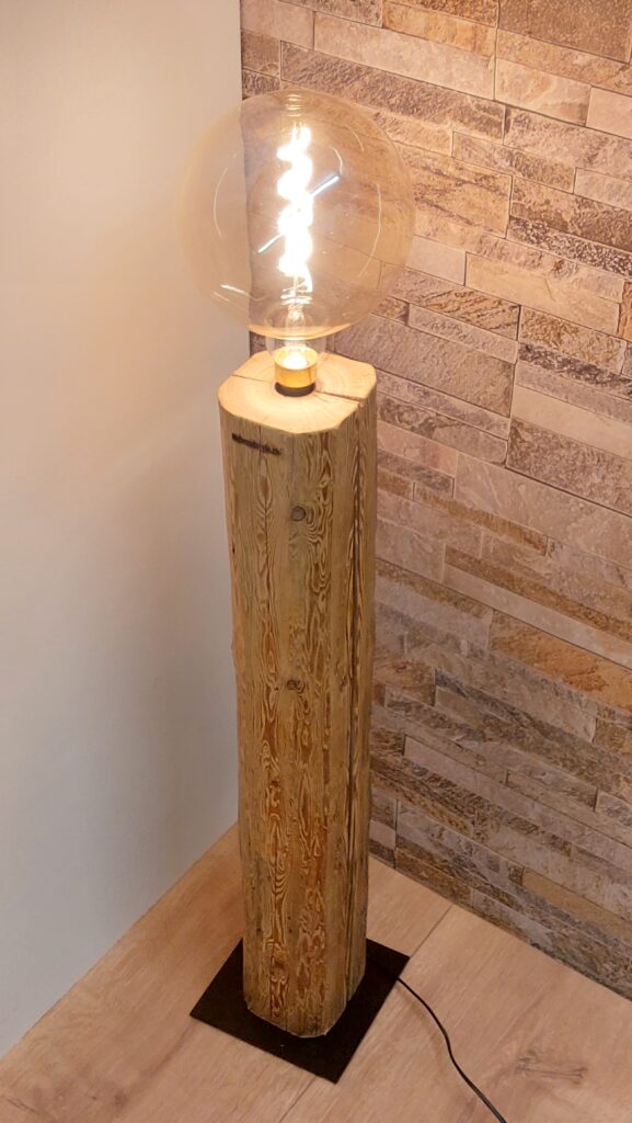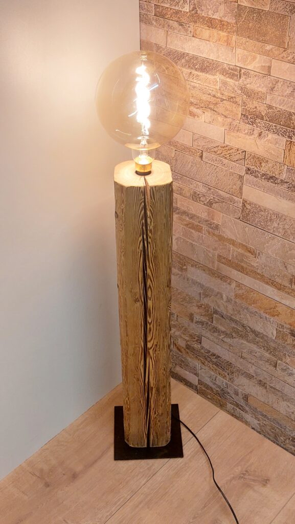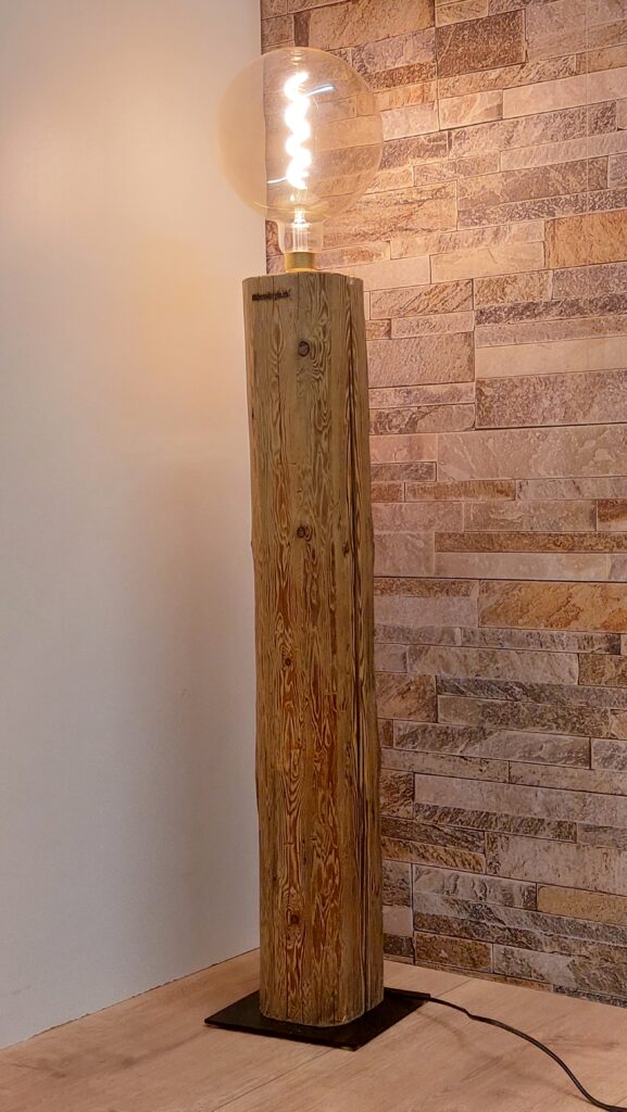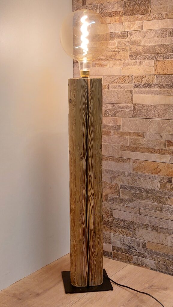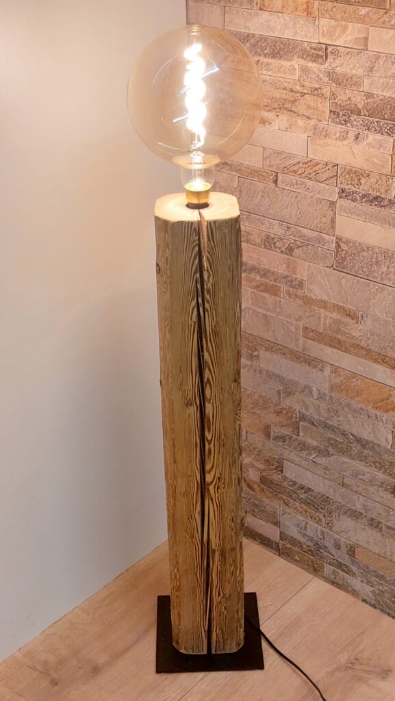 Diese einzigartige Stehlampe/Dekolampe aus einem schönen Altholzbalken bringt Wärme ins Wohnzimmer. Sie hat eine Gesamthöhe von 114cm (inkl. Leuchtmittel), wobei der Altholzbalken eine Höhe 87cm und einen Querschnitt von ca. 13×12.5cm hat. Die Stromführung verläuft komplett im Balken und ist daher von aussen nicht ersichtlich. Für einen sicheren Stand sorgt eine schwarze Metallplatte mit den Massen 20x20cm.
