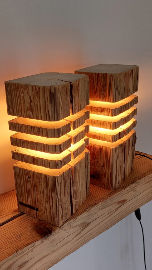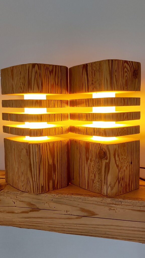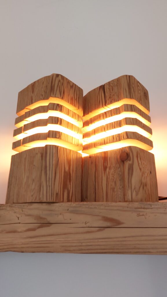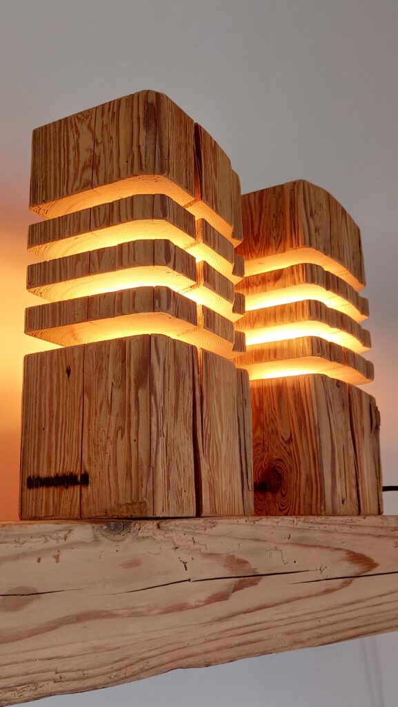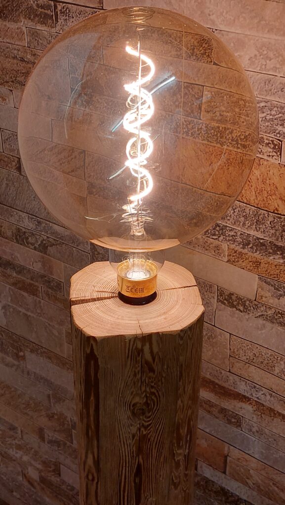 Diese Oldwoodstyle-Kreation ist eine Dekolampe, welche aus einem gebürsteten Fichten-Altholzbalken hergestellt wurde. Die verdrehte Struktur ist ein spezieller Blickfang, und für eine gemütliche Beleuchtung sorgt eine auswechselbare 670mm lange, energiesparende Long Tube LED. Diese LED mit einer E27-Fassung erzeugt ein warmweisses Licht mit der Lichtfarbe von 2500 Kelvin und hat eine Intensität von 440 Lumen. Die LED kann mittels Schalter ein- und ausgeschaltet werden, wobei die gesamte Kabelführung mittig im Balken verläuft.