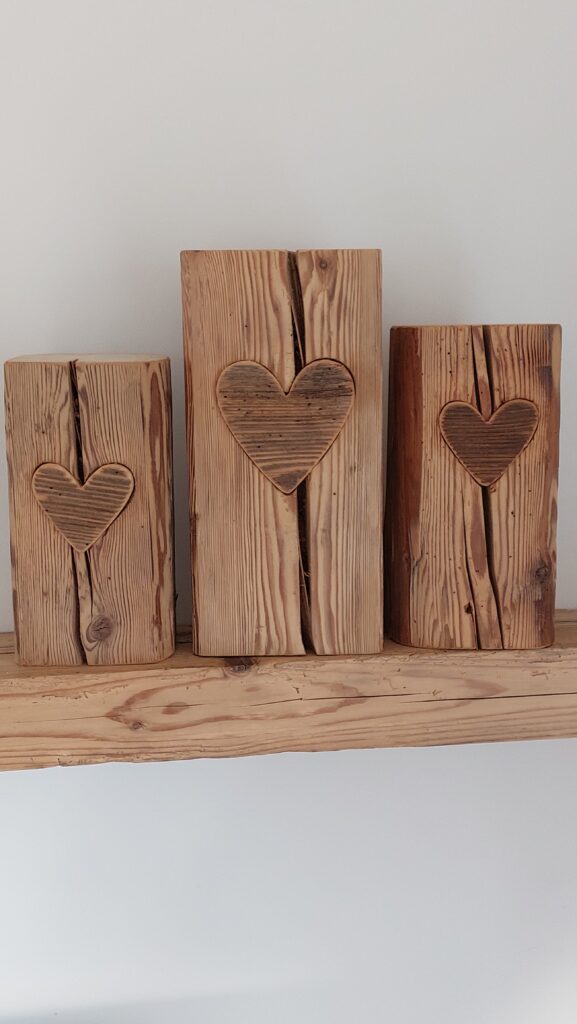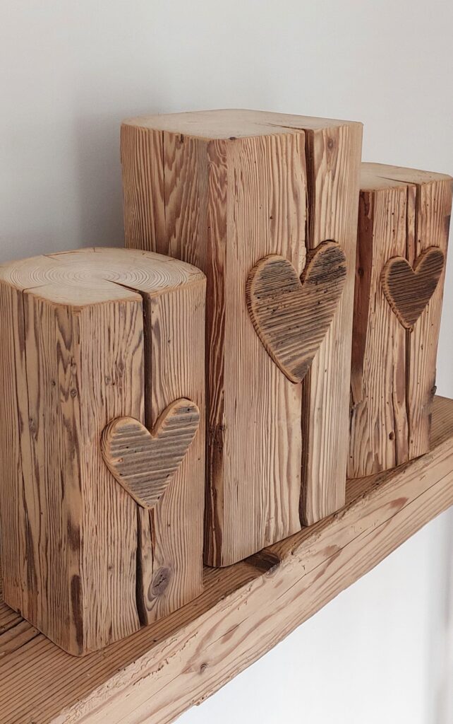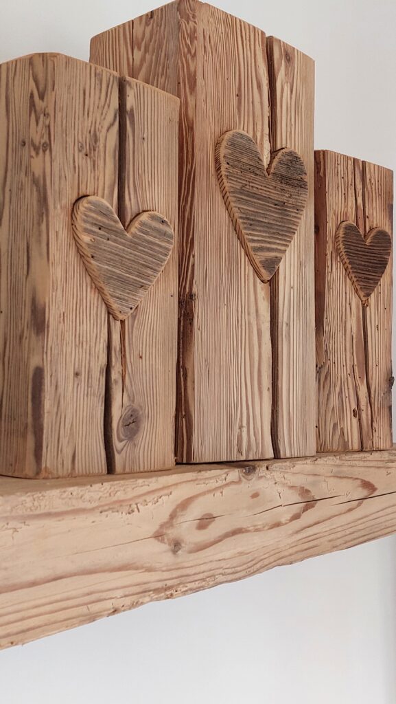 Wollen Sie jemandem ein Herz schenken? Diese Altholzsäulen sind ein Hingucker, wobei die aus einem Altholzbrett hergestellten und in den Balken eingepassten Herzen diese Dekosäulen einzigartig machen. Es stehen drei verschiedene Modelle zur Auswahl: