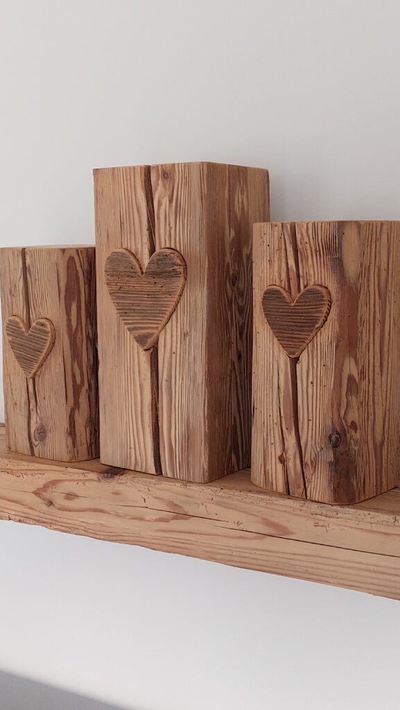 Diverse Teelichthalter aus gebürsteten Altholzbalken.