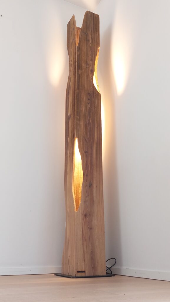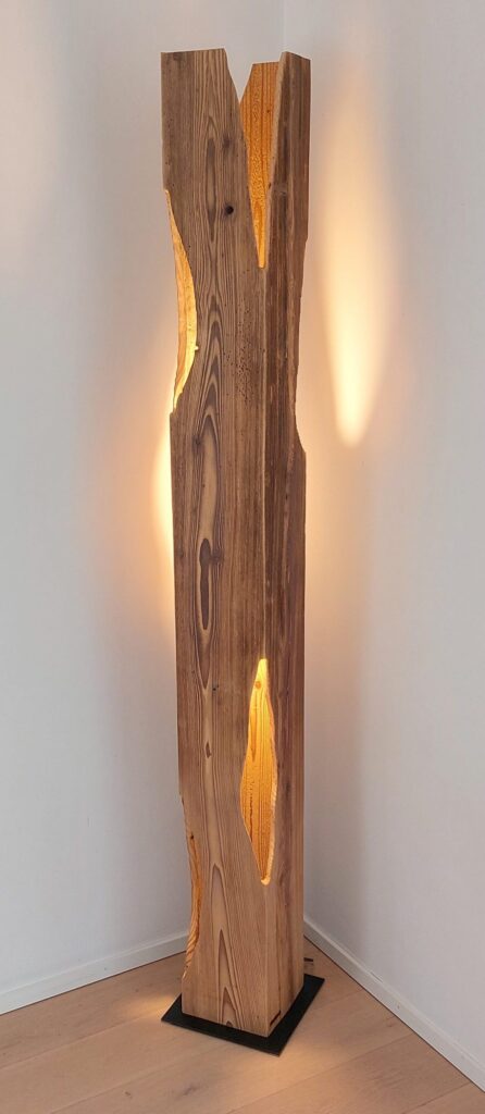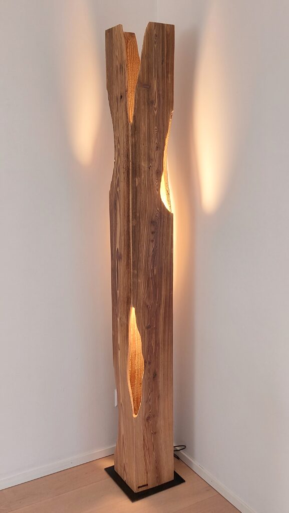 Schirm-Stehleuchte aus einem Altholzbalken