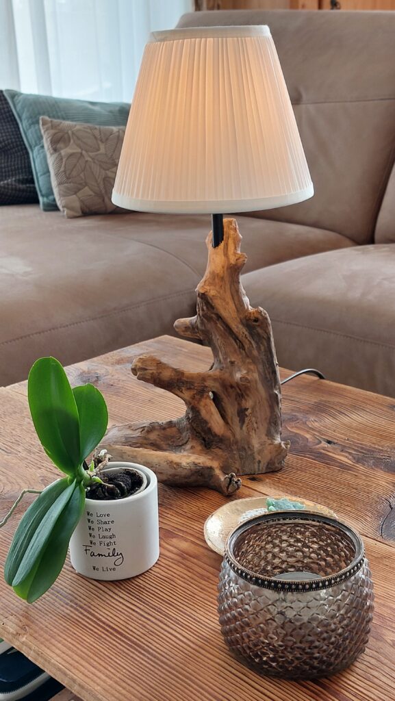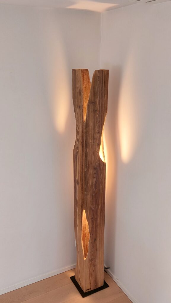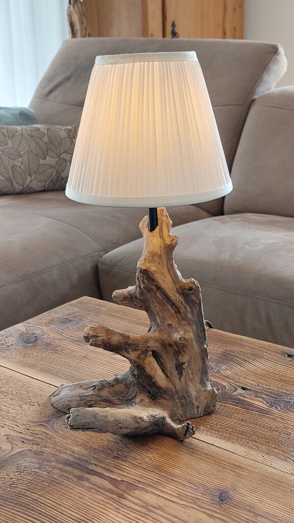 Diese spezielle Stehlampe besteht aus einem einzigartigen Bodensee-Schwemmholz mit einem ausgeprägten Hell-Dunkel-Kontrast. Egal ob als Leselampe neben dem Sofa oder als Beleuchtung im Esszimmer – diese Stehlampe ist definitiv ein Blickfang.