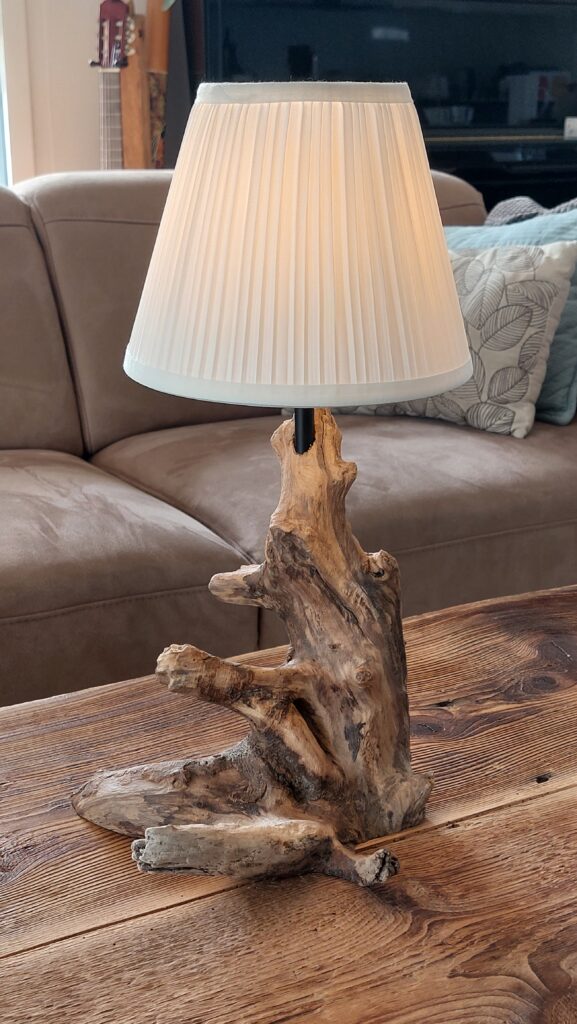 Diese einzigartige Tischlampe wurde aus einem schönen, wellenartig geschwungenen Bodensee-Schwemmholz hergestellt. Die Gesamthöhe inkl. Leuchtmittel beträgt ca. 24cm.