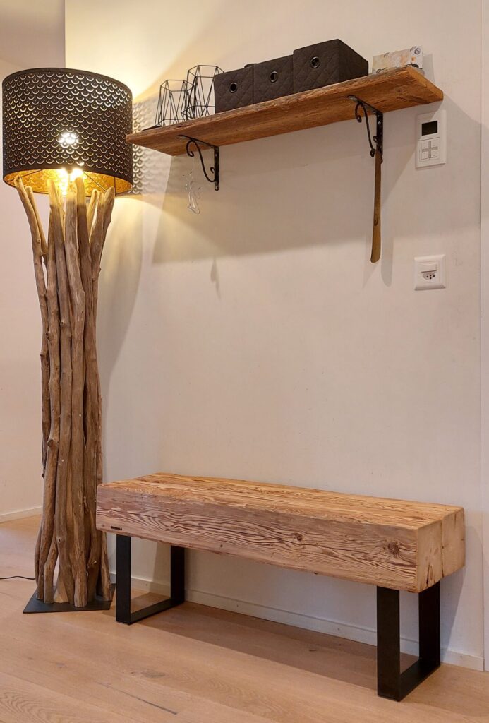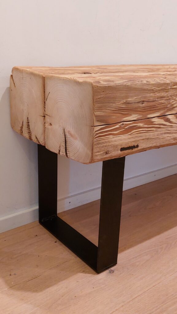Der Altholzbalken stammt aus dem Cafe Seeger in St. Gallen, ein Gebäude, das kurz nach 1840 erbaut wurde. Er ist also ein Stück Geschichte, das sich nahtlos in moderne Wohnungen und klassische Einrichtungen einfügt.