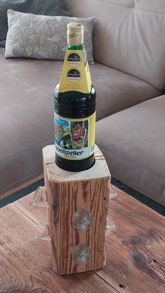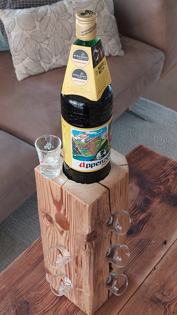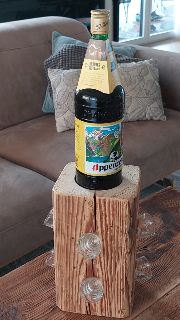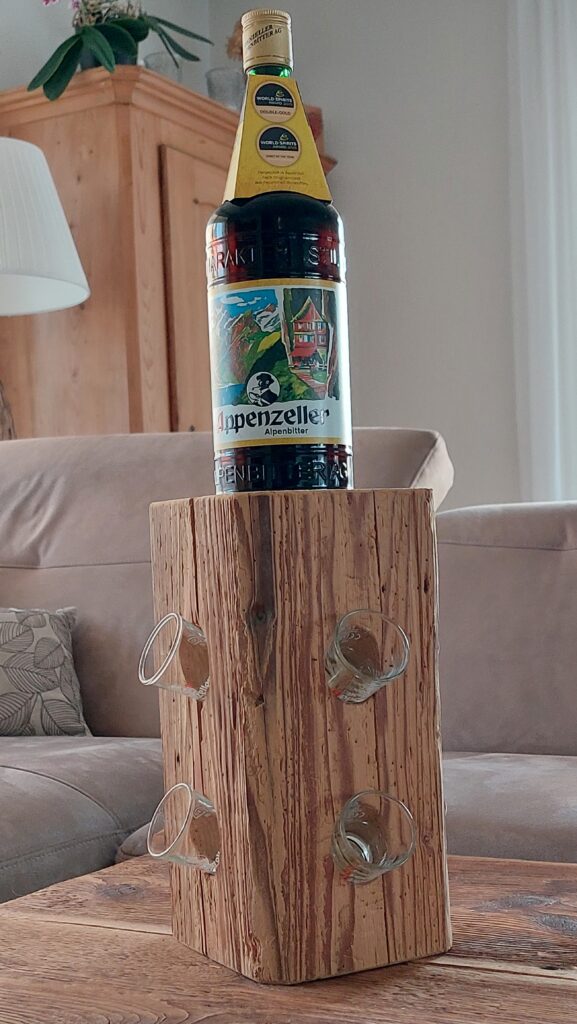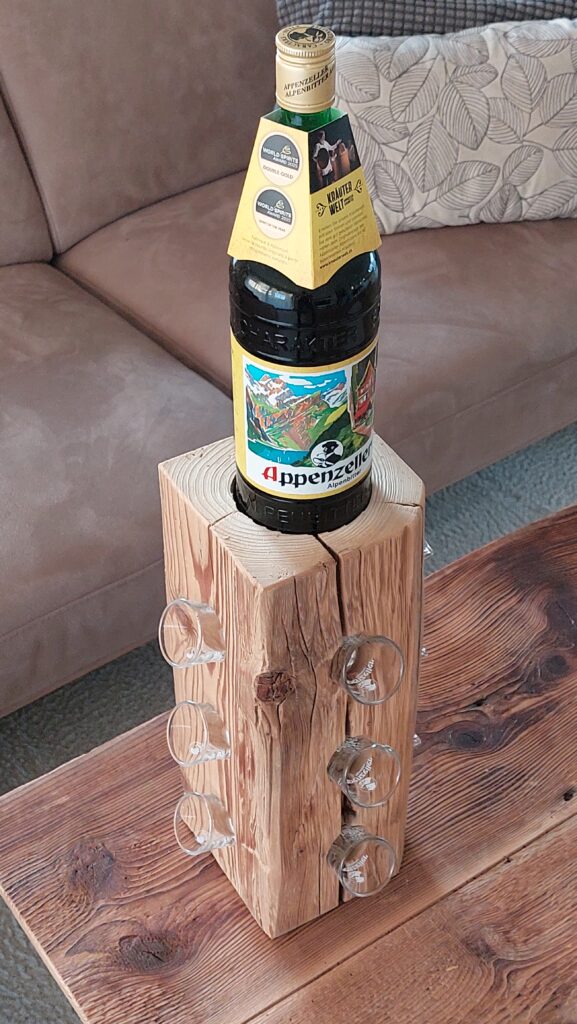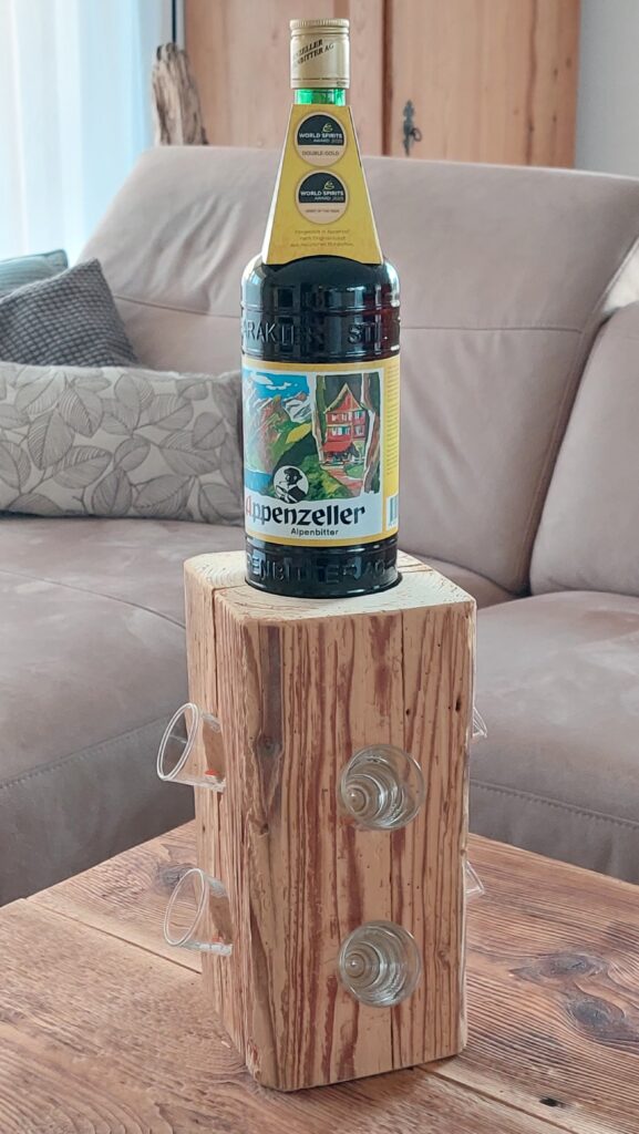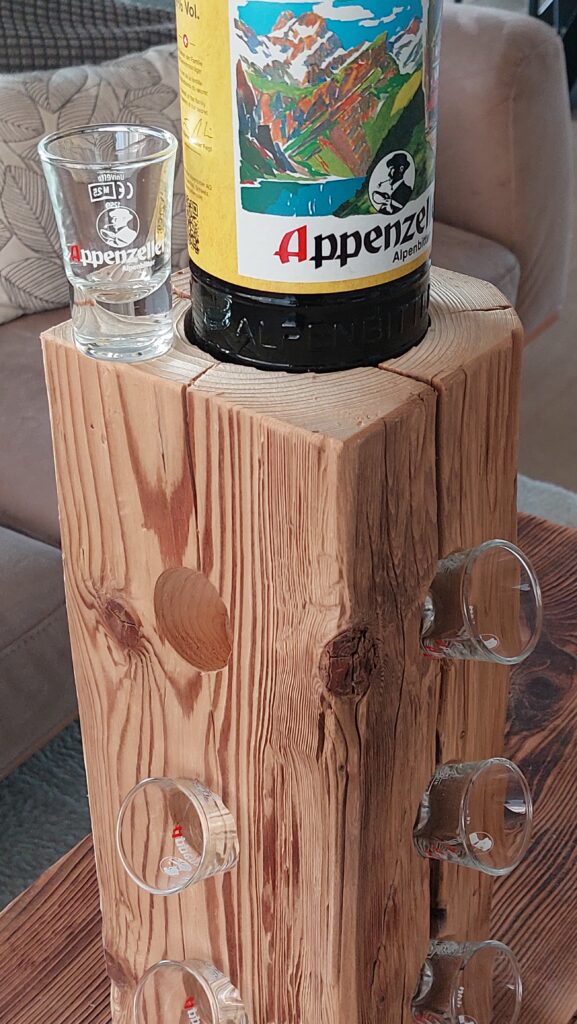 Diese rustikale Appenzeller-Altholzsäule aus einem gebürsteten Fichten-Altholzbalken ist ein Hingucker und passend für den geselligen Abend. Die Säule ist ca. 36.5cm hoch und hat oben eine runde Ausfräsung mit einem Durchmesser von ca. 86mm und seitlich total 12 Ausbohrungen mit einem Durchmesser von 38mm, sodass eine Flasche und 12 (Appenzeller-) Schnapsgläser dekorativ präsentiert werden können.