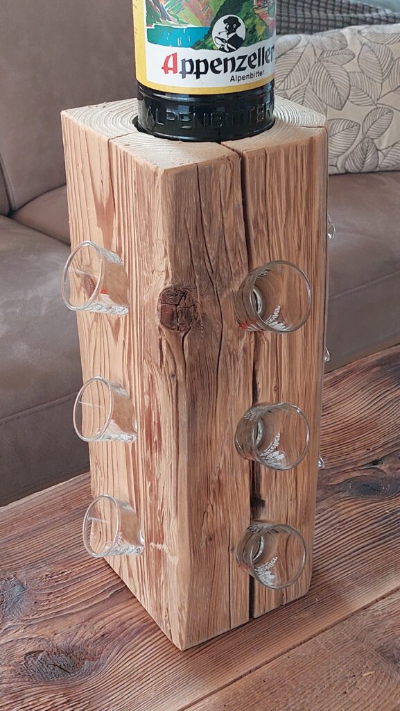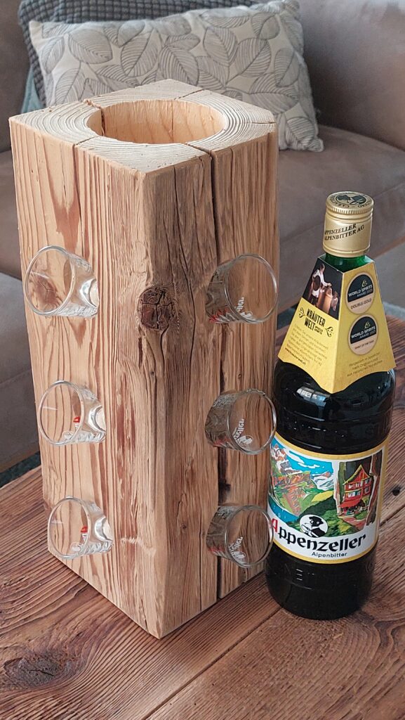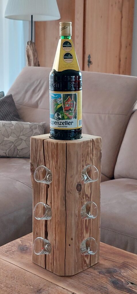 Diese rustikale Appenzeller-Altholzsäule aus einem gebürsteten Fichten-Altholzbalken ist ein Hingucker und passend für den geselligen Abend. Die Säule ist ca. 28cm hoch und hat oben eine runde Ausfräsung mit einem Durchmesser von ca. 86mm und seitlich total 8 Ausbohrungen mit einem Durchmesser von 38mm, sodass eine Flasche und 8 (Appenzeller-) Schnapsgläser dekorativ präsentiert werden können.