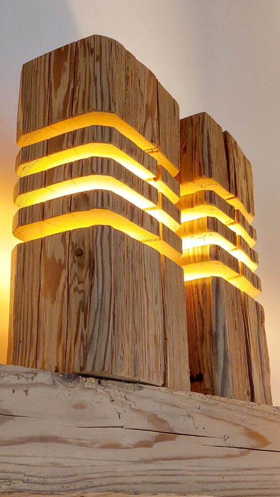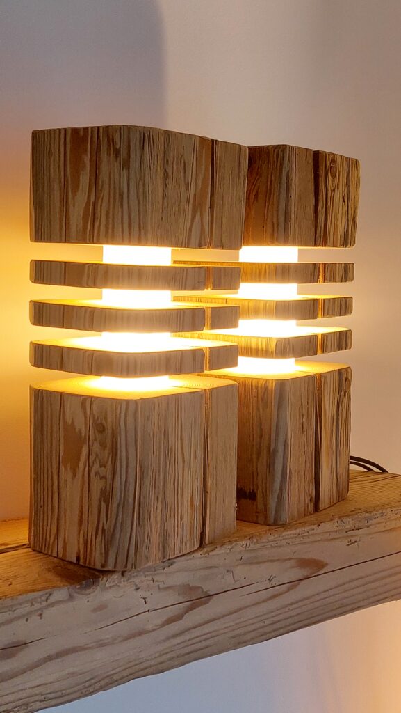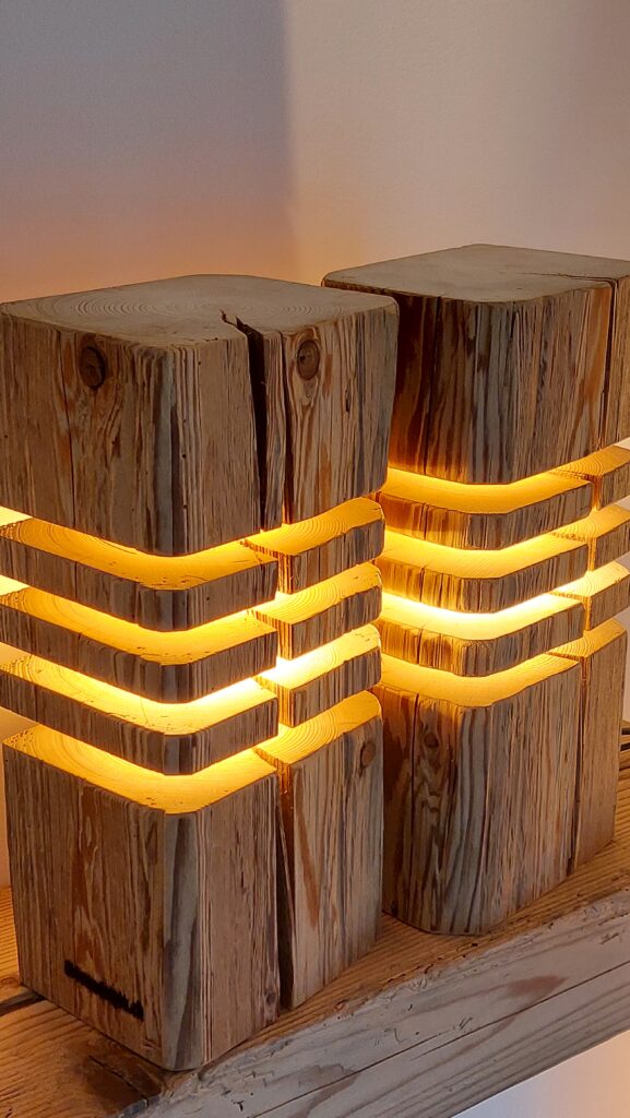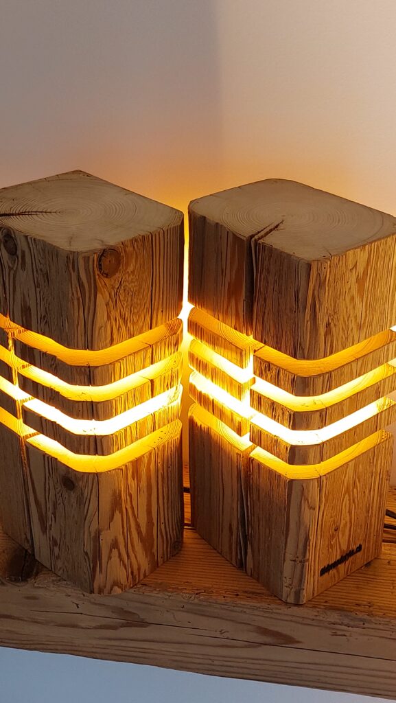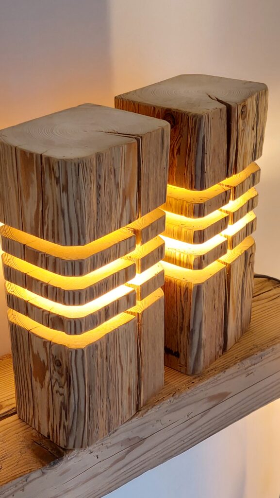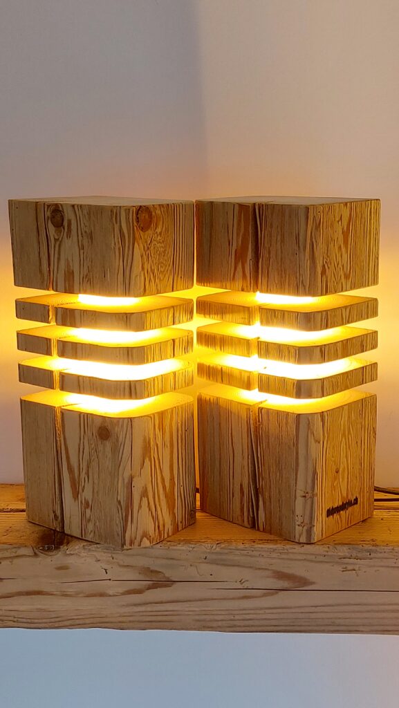 Diese beiden Nachttischlampen sind absolute Unikate, welche aus einem schönen, gebürsteten Fichten-Altholzbalken hergestellt wurden. Mit energiesparenden Long Tube LEDs ausgestattet, sorgen sie für ein warmweisses Licht und erzeugen damit eine gemütliche Beleuchtung in jedem Schlafzimmer. Die LEDs haben ein E27-Gewinde und eine Lichtstärke von 200 Lumen, zudem können sie mittels Schalter ein- und ausgeschaltet werden.