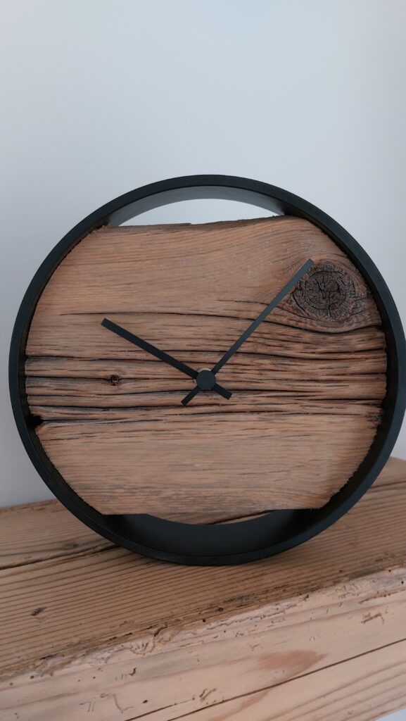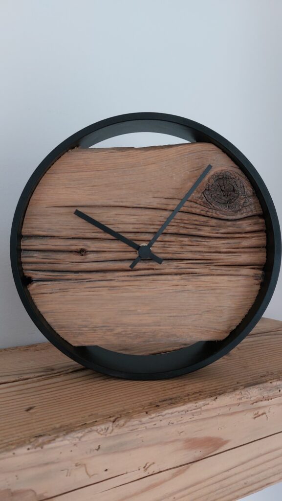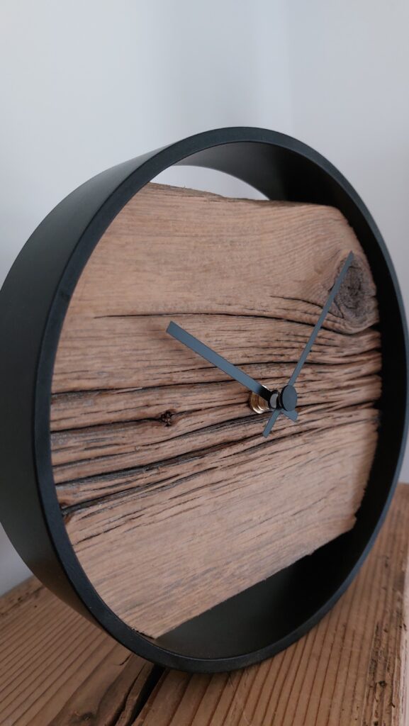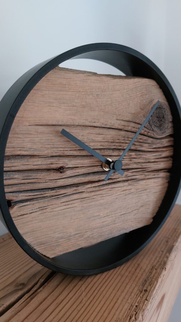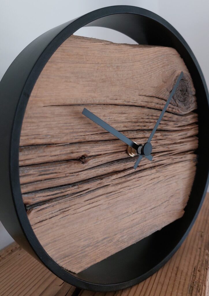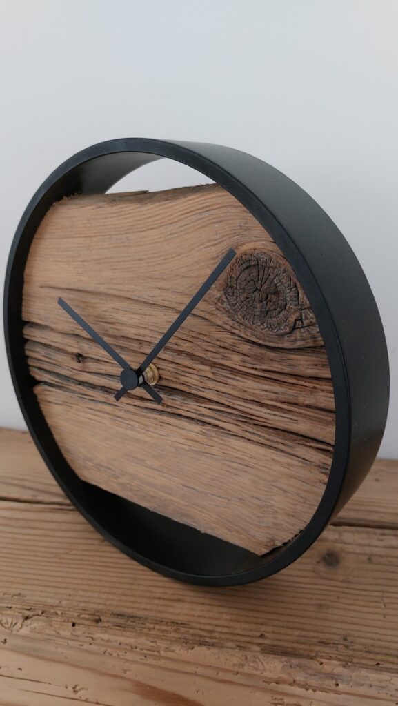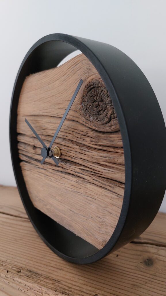Altholzuhr mit schwarz matt lackierter kreisförmiger Umrandung. Die Uhr hat unten 2 Silikonnoppen, sodass sie standfest auf eine Unterlage gestellt werden kann. Sie hat jedoch auch eine Vorrichtung auf der Rückseite, um sie an der Wand aufzuhängen.